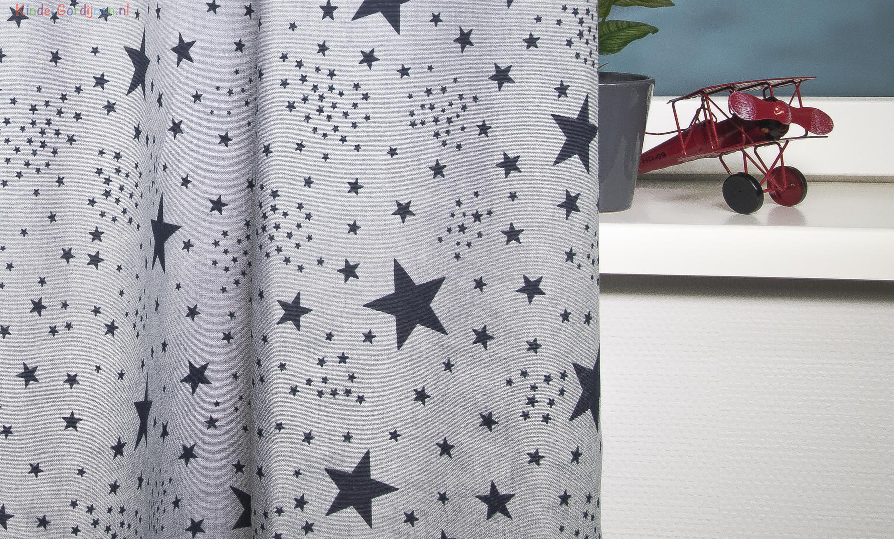 Fonkelende kamerhoge gordijnen met marineblauw of donkerrode sterren van verschillend formaat op een ietwat grijze ondergrond.