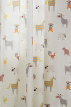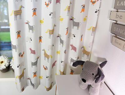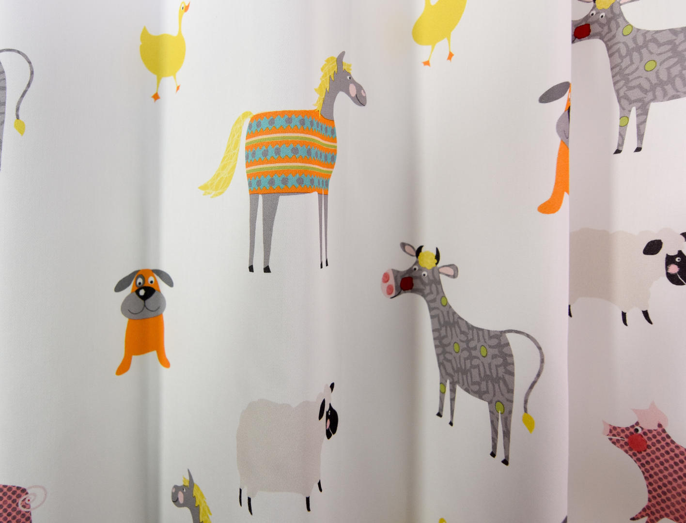 SCHATTIG! Nostalgisch getekende boerderijdieren zijn afgebeeld op dit gordijn. De stof is soepelvallend en in satijnlook fijn geweven. Het gordijn is leverbaar in 2 verschillende kleurpaletten, beide geschikt voor zowel de jongens- als meisjeskamer. De koe is b.v. 10 cm groot, het gansje 7 cm. Krijg jij een kindje en je weet niet wat “het” gaat worden, dan is dit een uitstekende keuze. Stippen behang op 1 wand is een leuke combi, al dan niet met een subtiel glansje erop. Voor verduistering graag optie voeren in het bestelproces aanvinken