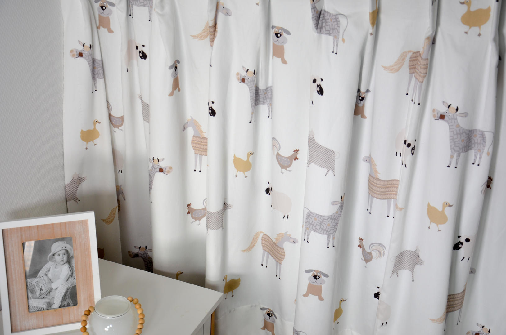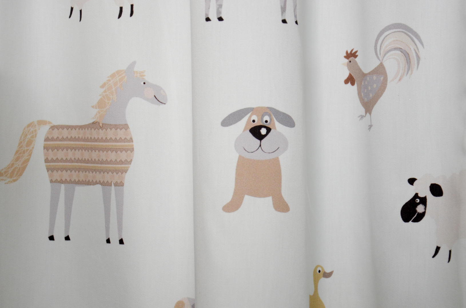 SCHATTIG! Nostalgisch getekende boerderijdieren zijn afgebeeld op dit gordijn. De stof is soepelvallend en in satijnlook fijn geweven. Het gordijn is leverbaar in 2 verschillende kleurpaletten, beide geschikt voor zowel de jongens- als meisjeskamer. De koe is b.v. 10 cm groot, het gansje 7 cm. Krijg jij een kindje en je weet niet wat “het” gaat worden, dan is dit een uitstekende keuze. Stippen behang op 1 wand is een leuke combi, al dan niet met een subtiel glansje erop. Voor verduistering graag optie voeren in het bestelproces aanvinken