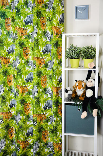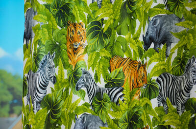 GRRR . TIJGERGORDIJNEN! En niet alleen tijger, want dierenprints zijn HOT! Zebra en neushoorn laten zich ook zien. Het patroon is gedrukt op matte, ietwat geribde stof. De tijger is 15 cm groot en kijkt uitdagend jouw kamer in. Durf jij het aan? De stof is voorradig, dus snelle levering gegarandeerd! Een extra kussen van deze stof maakt het thema natuurlijk compleet. Voor verduistering even laten voeren.