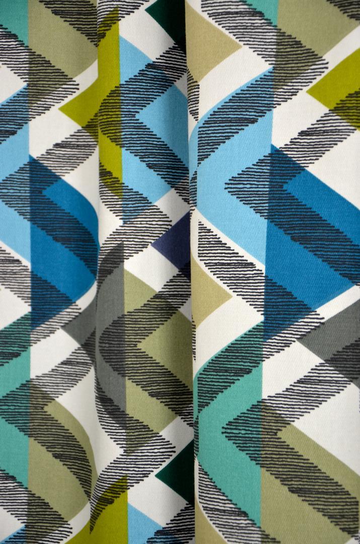 De naam van deze stof verklapt het al, deze gordijnen zijn geïnspireerd op de Scandinavische woontrend. Er wordt gespeeld met lijnen en figuren. Dat zorgt voor die grafische touch! Goed te combineren met neon kleuren of juist pastels. De print is gedrukt op dicht geweven, matte stof en leverbaar in 2 kleurcombinaties. De driehoekvorm is in de breedte 19 cm. Hier afgebeeld met bijpassende kussentjes, extra leuk!
