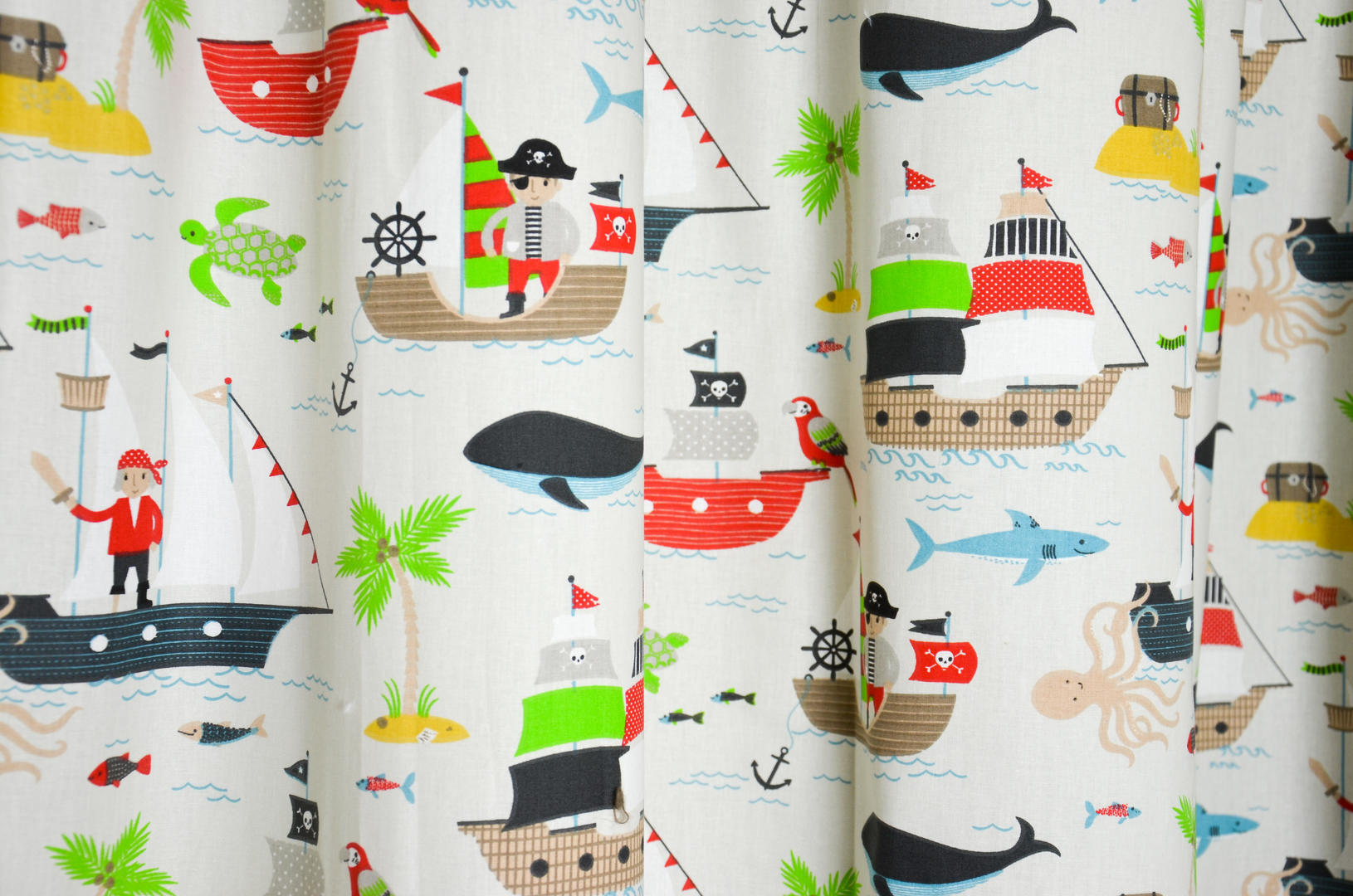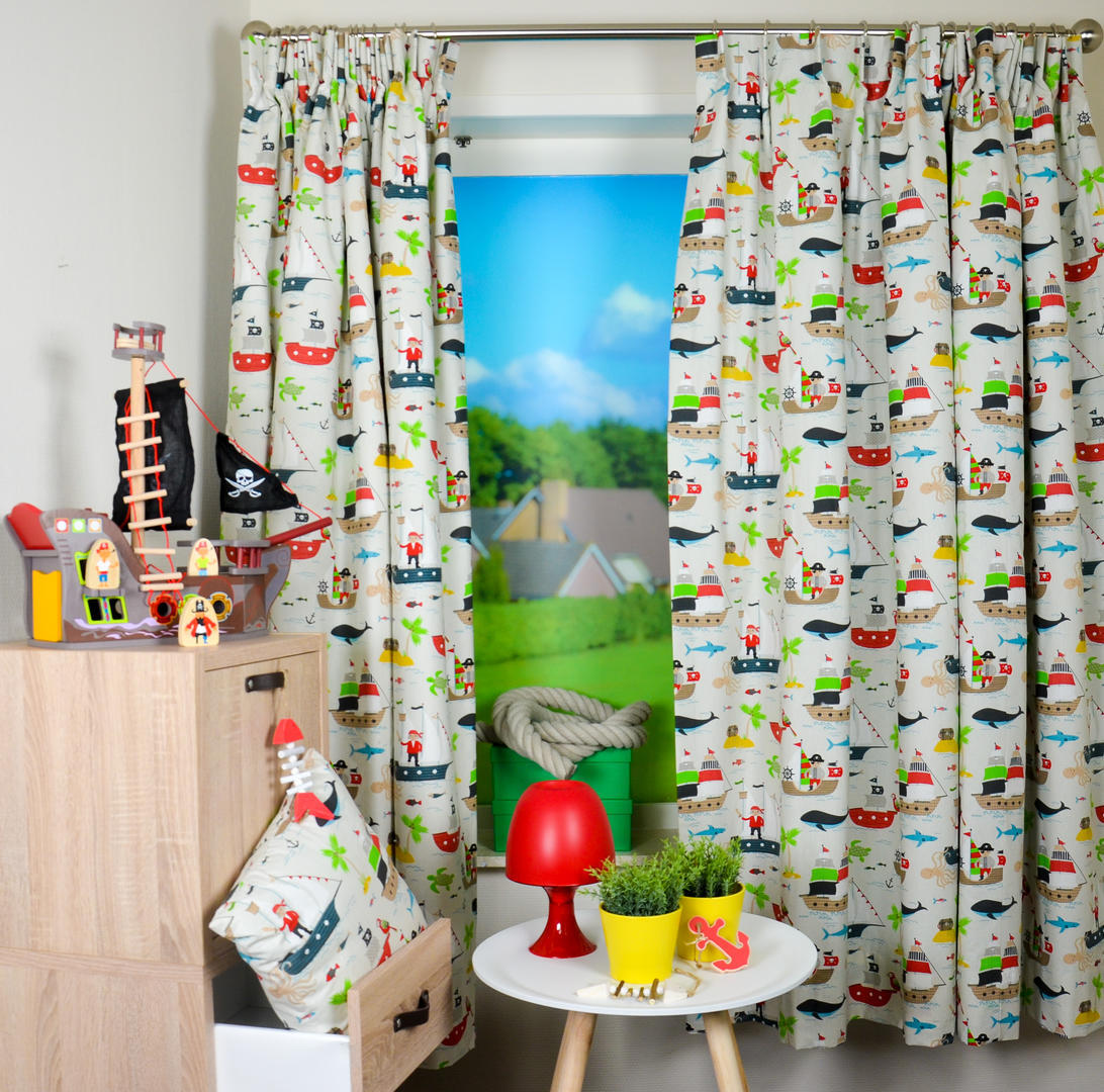 “Ai.. Ai .. Kapitein we hijsen de zeilen” Deze vrijgevochten piraatjes weten precies waar zij heen willen: naar verre landen met een tropisch klimaat. Palmbomen, kokosnoten en het zonnetje op je bol. Wie wil dat relaxte sfeertje nou niet op zijn slaapkamer? De afbeeldingen zijn gedrukt op gladde, matte katoen en leverbaar in 2 kleuren. De scheepjes zijn zo’n 10 cm in doorsnede. Wil je dat het gordijn ook verduisterd? Dan graag even laten voeren. Tot ooit op dat onbewoonde eiland!