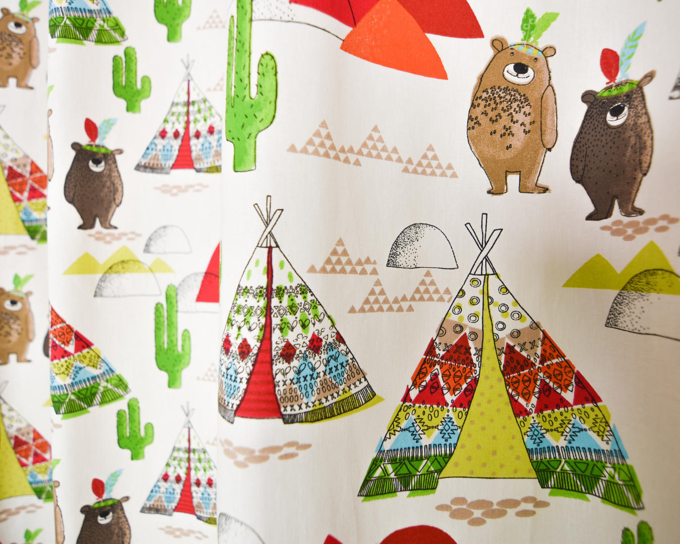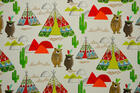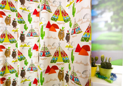 De naam van dit gordijn verklapt het al: Een indianentent! Een tipi tent werd vroeger van canvas of huiden gemaakt. Tegenwoordig associëren wij de naam vooral met de leuke kegelvorm. Natúúrlijk kunnen daar gezellige indiaantjes in komen wonen! De stof is leverbaar in 2 kleuren. De afbeeldingen zijn gedrukt op fijn geweven, matte katoen. Deze is gebroken wit van kleur. De tipi is 17 cm hoog. Voor extra verduistering even laten voeren. Maak jij er met veren een indianenkamer van?