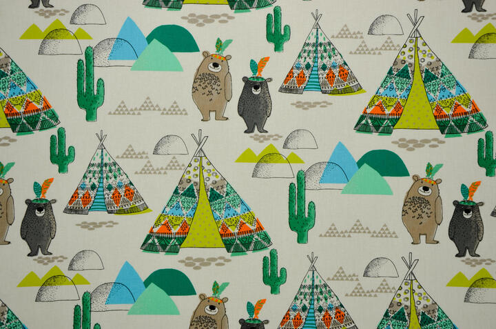 De naam van dit gordijn verklapt het al: Een indianentent! Een tipi tent werd vroeger van canvas of huiden gemaakt. Tegenwoordig associëren wij de naam vooral met de leuke kegelvorm. Natúúrlijk kunnen daar gezellige indiaantjes in komen wonen! De stof is leverbaar in 2 kleuren. De afbeeldingen zijn gedrukt op fijn geweven, matte katoen. Deze is gebroken wit van kleur. De tipi is 17 cm hoog. Voor extra verduistering even laten voeren. Maak jij er met veren een indianenkamer van?