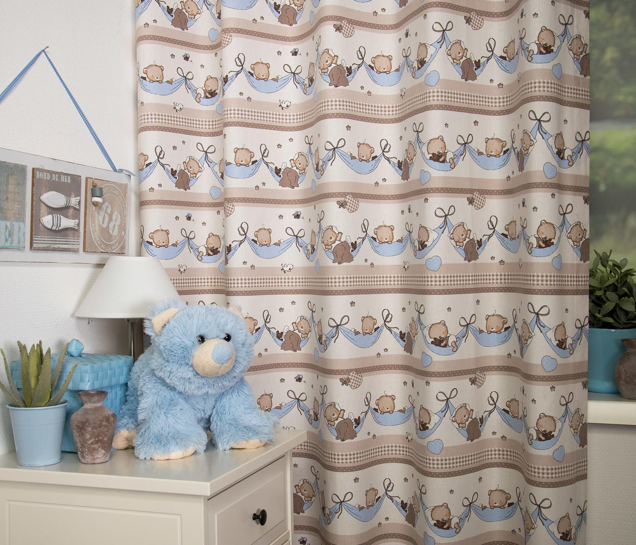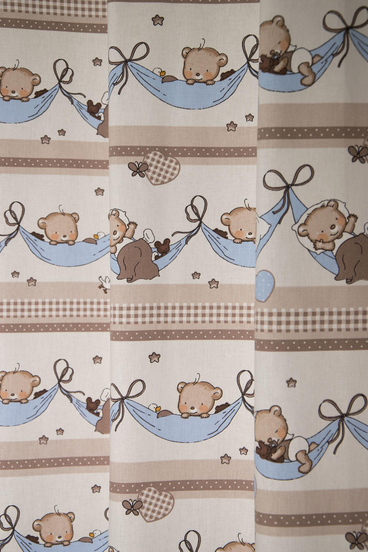 Aandoenlijk babygordijn met zachte knuffelberen die heerlijk wegdommelen of net weer terugkomen uit dromenland. Het gordijn is verkrijgbaar in twee uitvoeringen. Twijfelt u tussen twee kleuren? Vraag een knipstaaltje aan. Zo weet u precies wat u in huis haalt!