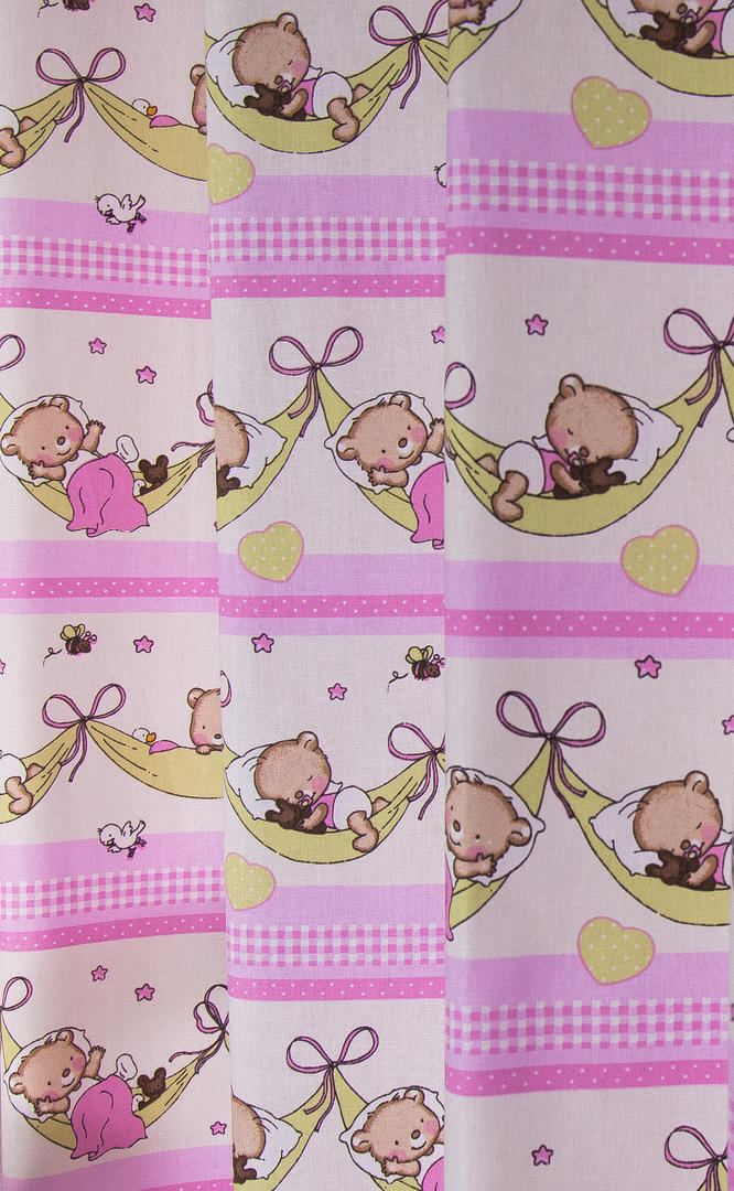 Aandoenlijk babygordijn met zachte knuffelberen die heerlijk wegdommelen of net weer terugkomen uit dromenland. Het gordijn is verkrijgbaar in twee uitvoeringen. Twijfelt u tussen twee kleuren? Vraag een knipstaaltje aan. Zo weet u precies wat u in huis haalt!