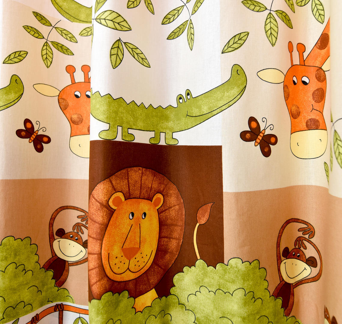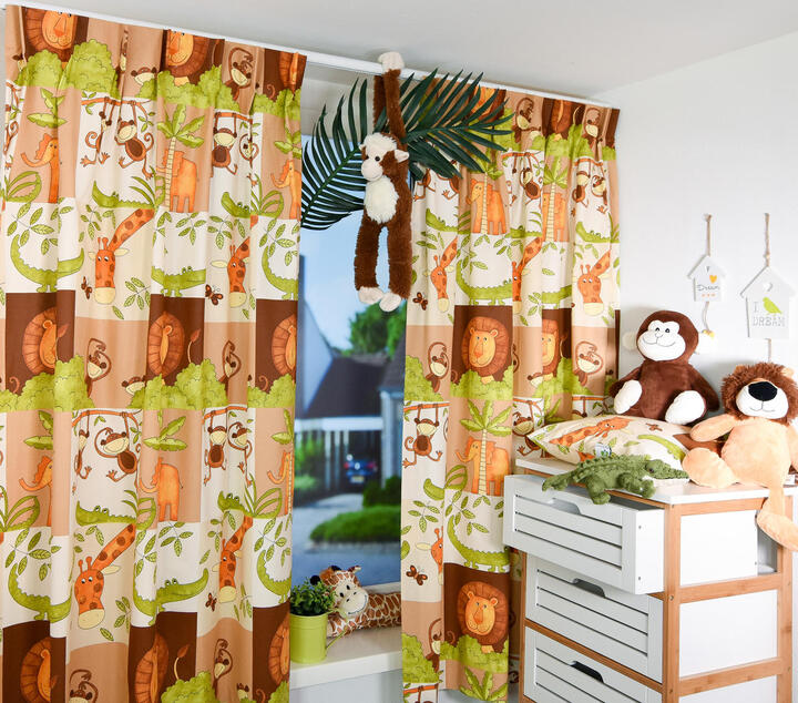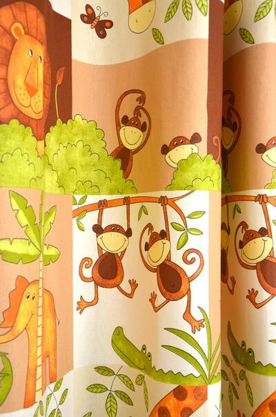 Wat een héérlijk nostalgisch gordijn! De safaridieren zijn in warme tinten afgebeeld op de stof. Deze is leverbaar in 2 kleuren. Het thema een bewezen tijdloze klassieker! De eigenwijze apen slingeren aan een liane tak en de leeuw kijkt parmantig om zich heen. De verschillende dieren zijn gedrukt op matte stof en verdeeld in blokken van 17 x 20 cm. Het royale blokpatroon geeft rust en daardoor kan het gordijn uitstekend tot de grond gemaakt worden. Voor extra verduistering graag even voeren.