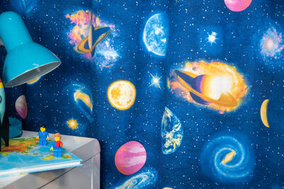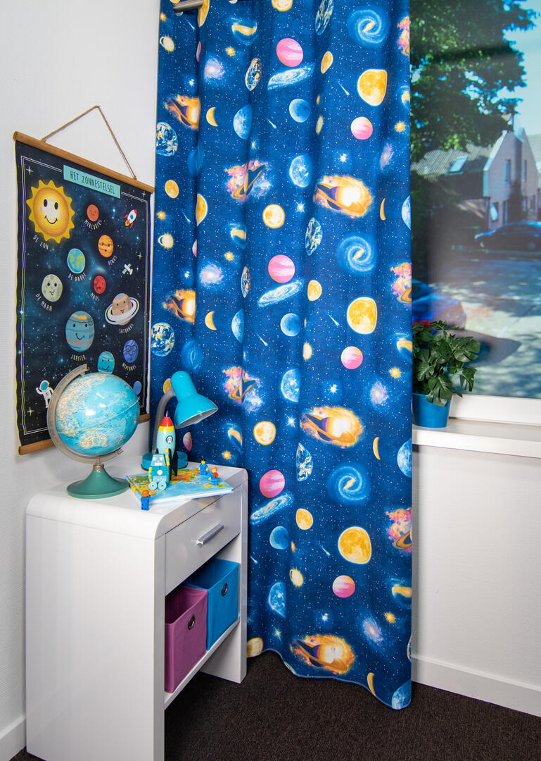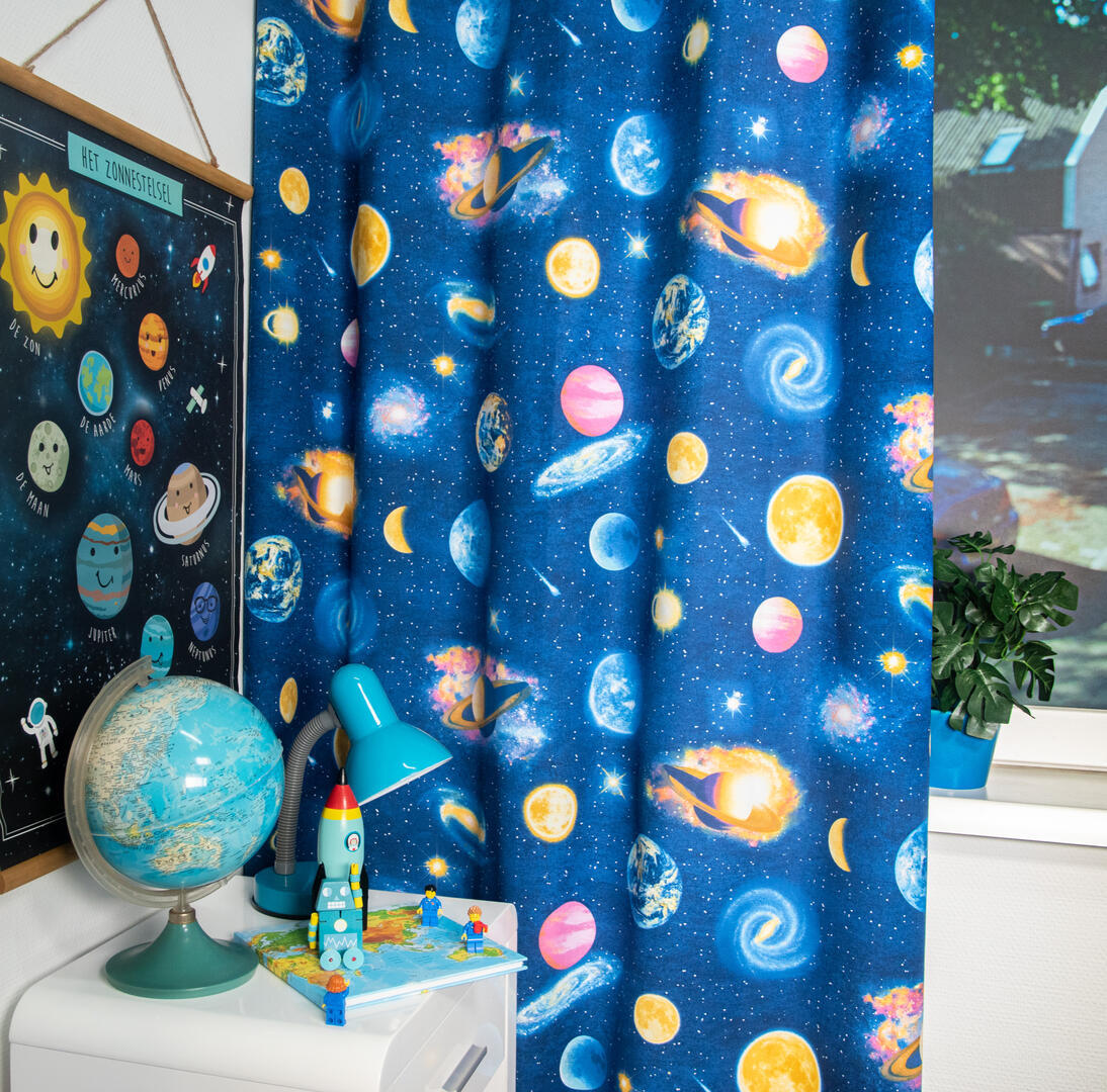 SUPER GAAF GORDIJN! De afbeeldingen op de stof zijn scherp en helder van kleur. De sterren lijken letterlijk in je slaapkamer te stralen! Wie wil dat effect nu niet? Slapen onder de sterrenhemel, fantastisch! Planeet aarde is 10 cm in doorsnede en gedrukt op matte, kwalitatief zware polyesterkatoen. Dit gordijn is van jong tot oud een gewéldig mooie & bijzondere aanwinst! Slaap jij voortaan ook nabij ons sterrenstelsel?