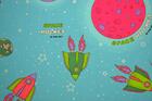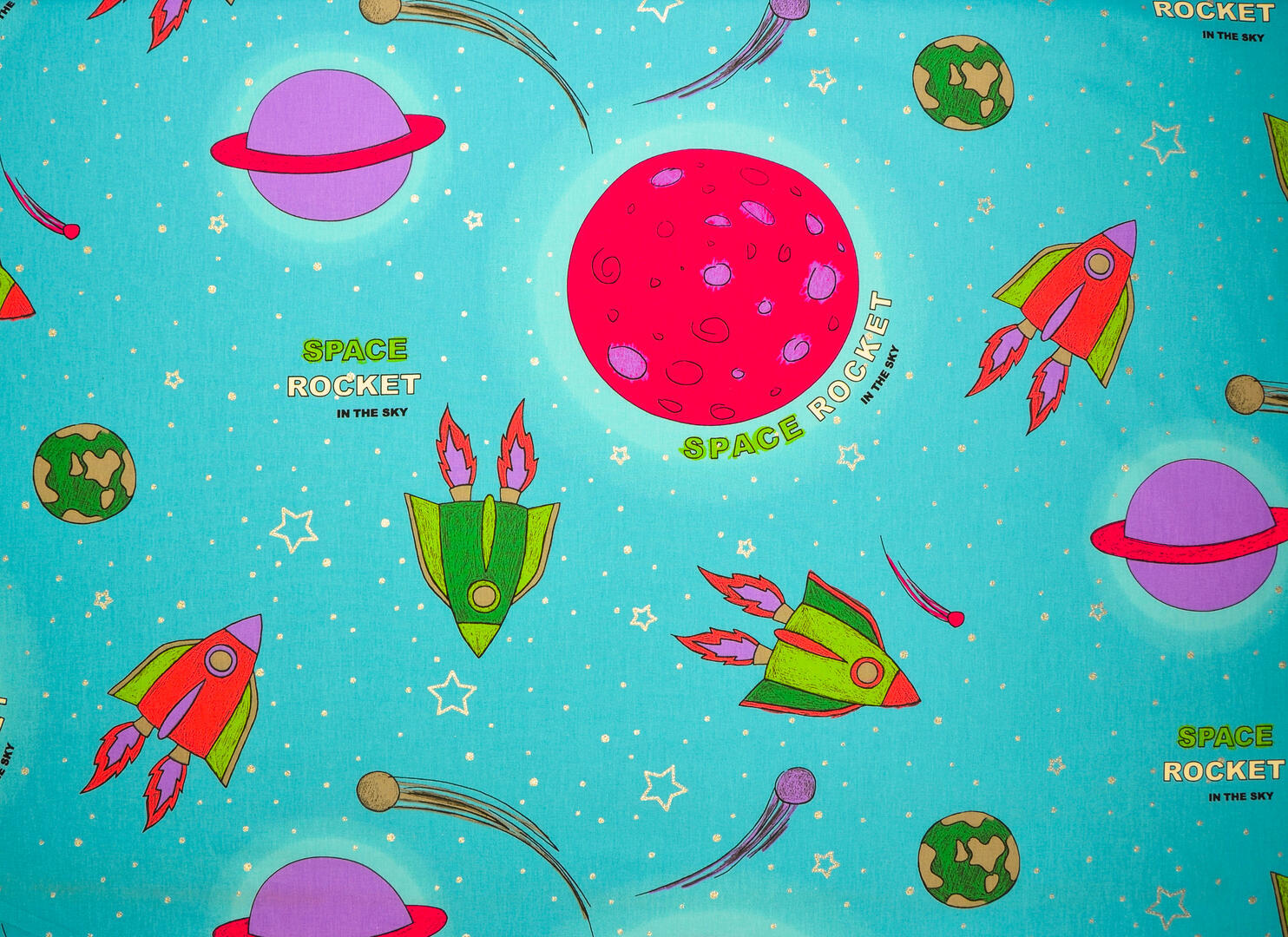 Space Rocket in the sky! Knallend kindergordijn in felle kleuren met raketten en planeten. De katoenen gordijnstof kunnen we voor u voeren en verwerken tot volledig verduisterend gordijn.