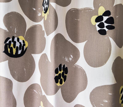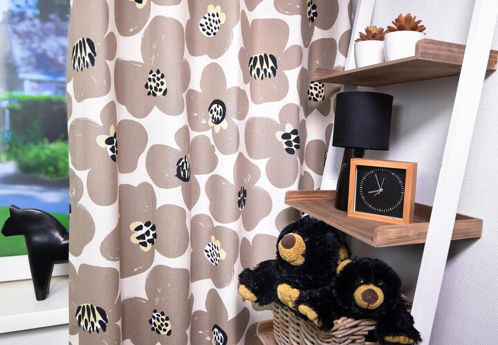 Katoenen kindergordijn met grof geschilderde bloemen. Verkrijgbaar in meerdere kleuren en geschikt voor allerlei soorten kinderkamers.