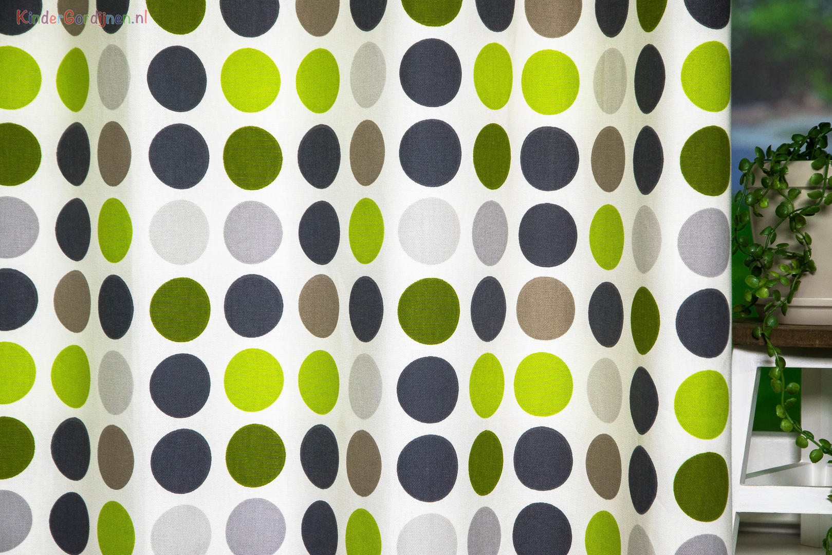 STIPPEN zijn HIP! En dit gordijn heeft royale stippen in frisse lime kleuren. De stip is 4,5 cm in doorsnede en is in wisselende groentinten op het doek aangebracht. Dat geeft een speels en kleurrijk effect. De ondergrond is een warm witte, dicht geweven stof, die desgewenst verduisterend gevoerd kan worden.