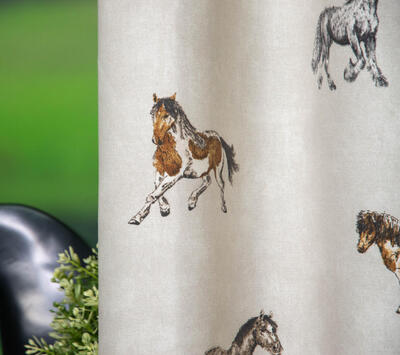 Het paardengordijn Stables! Op de ecru stof pronken verschillende paarden, sommige in galop en anderen in draf. De dikke maar soepele katoenen stof garandeert jarenlang plezier en duurzaamheid.