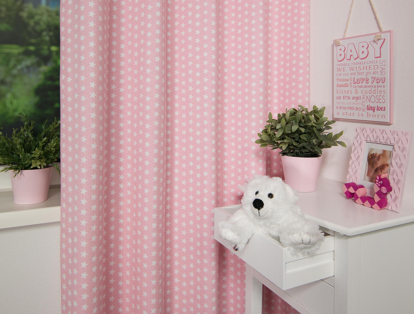 "Hallo daar! Welkom bij deze fijne Sterella babygordijnen! Onze speciale babystof voelt heerlijk zacht aan en past perfect bij alle leuke spulletjes in de babykamer, zoals hydrofieldoekjes, washandjes en het aankleedkussen. Onze gordijnstof is gemaakt van de allerbeste kwaliteit en is zelfs vuilwerend en antistatisch! We raden aan om het gordijn te laten voeren, zodat het verduisterend en isolerend is. Op die manier kan jouw kleintje genieten van een gezond dag- en nachtritme. Wil je eerst zelf ervaren hoe prachtig deze stof is? Bestel dan een knipstaaltje voordat je jouw gordijnen bestelt! Als je vragen hebt, sta ik altijd klaar om te helpen. Aarzel niet om contact met ons op te nemen!"