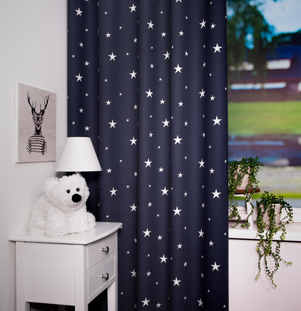 Met het donkerblauwe canvas als achtergrond en de witte sterren die schitteren in het duister, is het SuperNova kindergordijn perfect voor kinderen die van de ruimte en het universum houden. Het creëert een betoverende sfeer en stimuleert de verbeelding, waardoor de kinderkamer een echte speelplek en oase van creativiteit wordt.