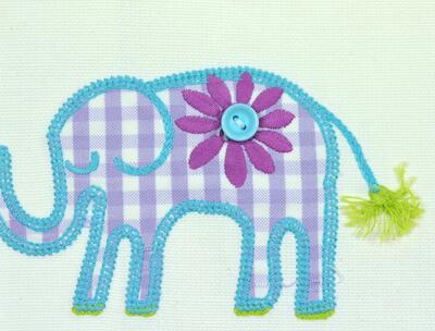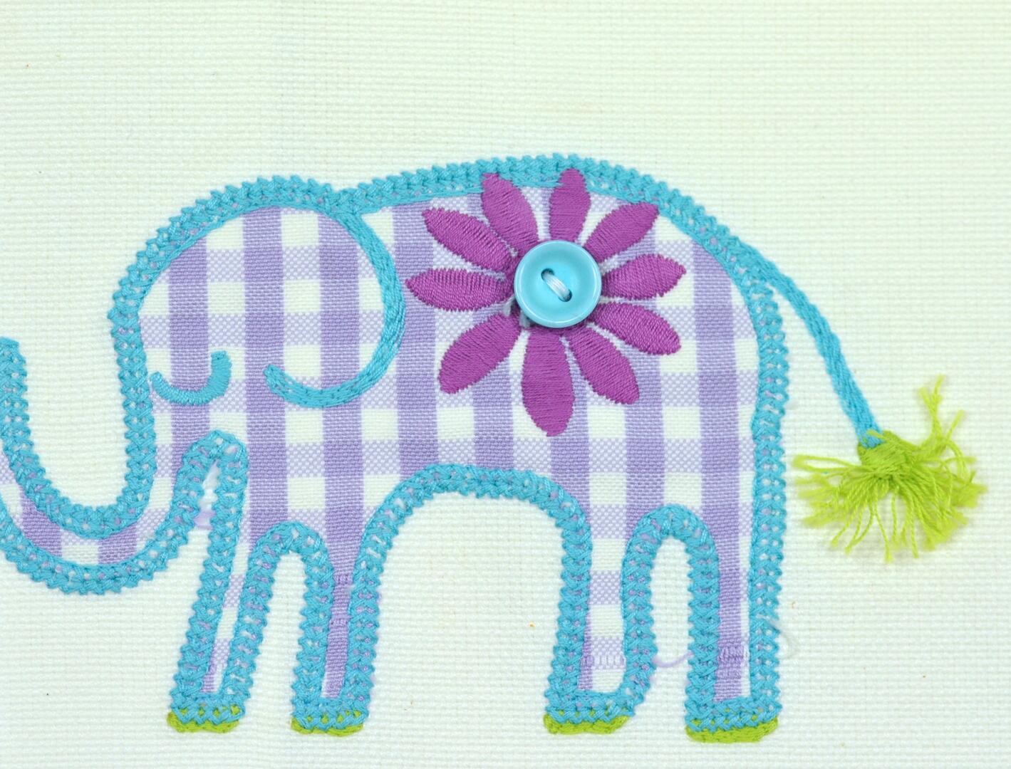 De olifanten zijn stuk voor stuk opgebouwd uit borduurwerk in combinatie met ingelegde printstofjes. Je ziet bijvoorbeeld paars-witte ruitjes, lila strepen en kleine bloemmotieven die netjes in het lijfje van de olifant zijn gezet en vervolgens rondom zijn vastgestikt met een iets dikker borduurgaren in turquoise of paars. Dit geeft een licht reliëf: de dieren liggen niet plat op de stof, maar komen een beetje omhoog. In sommige motieven is zelfs een klein knoopje in het ontwerp verwerkt, zoals bij de bloem op de olifant, wat een extra speels detail toevoegt en het handgemaakte karakter versterkt.
