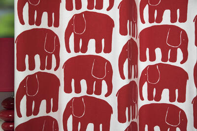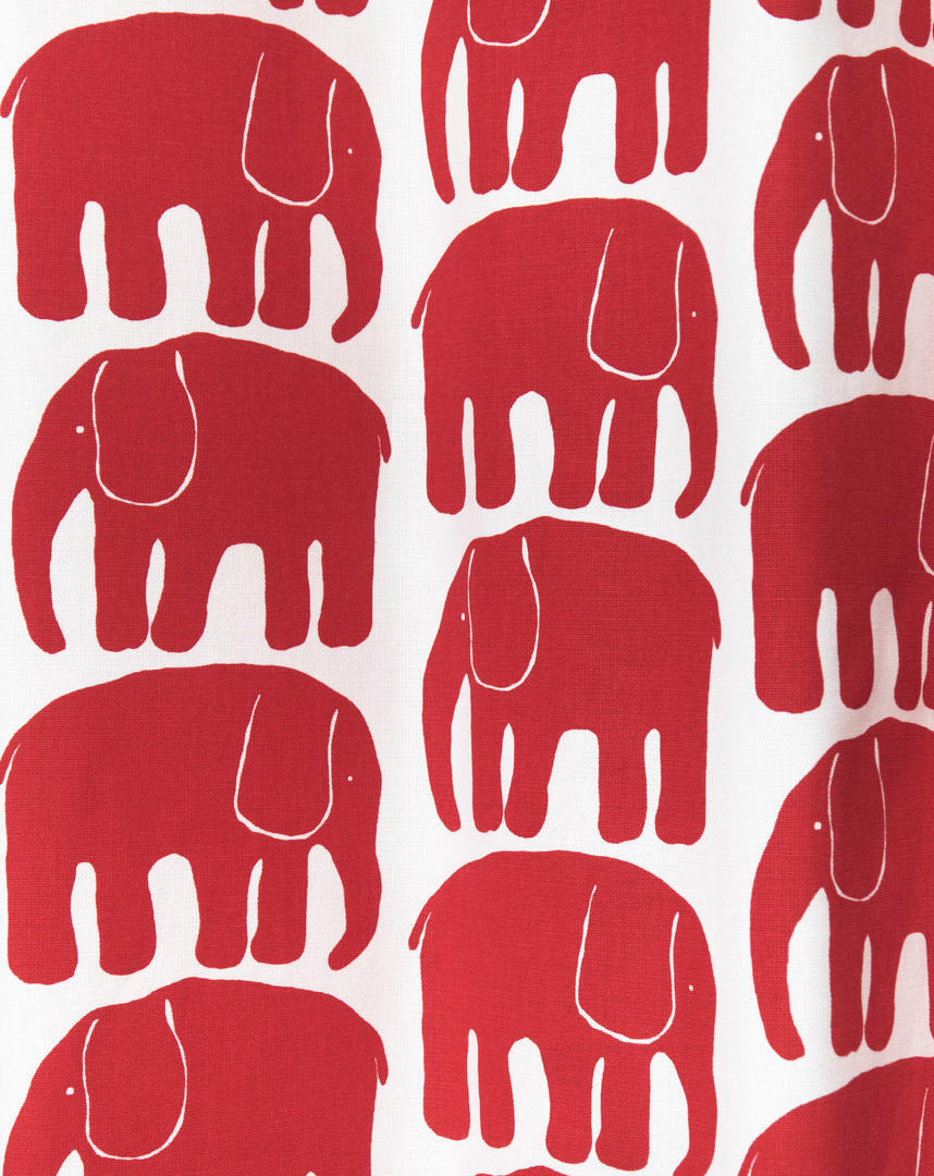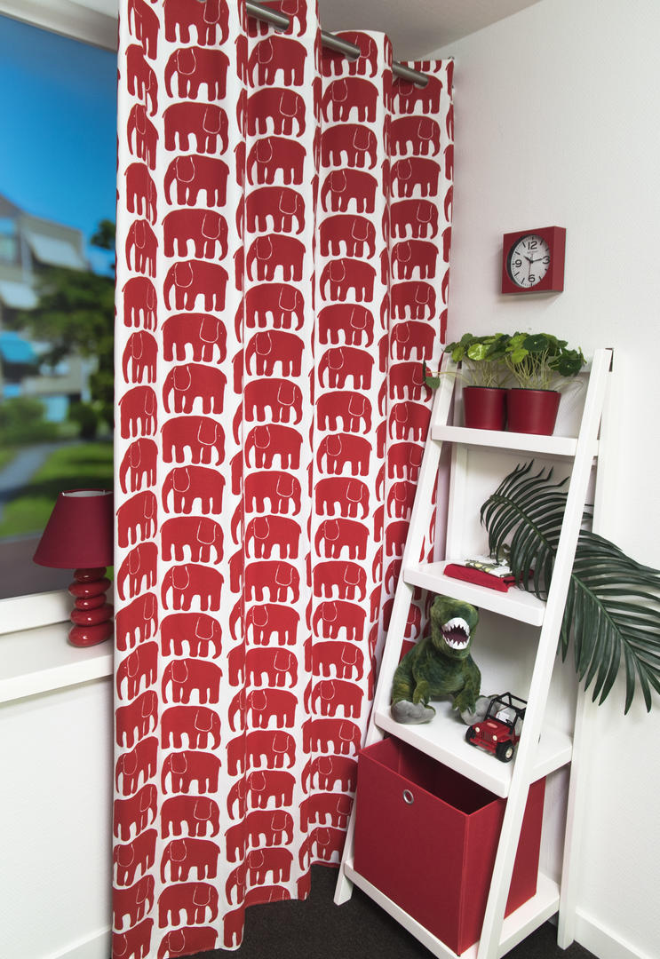 Elefantti olifant, hier als kunstzinnig dier. Wat een plezier om zo’n krachtige vorm gestileerd op je gordijn terug te zien. De Olifantjes zijn 10 cm groot en gedrukt op matte, luchtig geweven stof. Het gordijn is leverbaar in 2 kleurcombinaties, te weten warm-wit met fris middengrijs en multicolor gedrukt op dezelfde warm-witte ondergrond. Daardoor passend voor de jongens- en meisjesslaapkamer en geschikt als je niet weet “wat het gaat worden”. Het leuke van dit olifantengordijn is dat de repeterende vorm best strak aandoet en toch met een knipoog naar de kinderkamer. Kortom een gordijn voor diegene die van een rustige basis houdt en niet direct in een effen oplossing wil vallen. Voor extra verduistering graag even laten voeren.