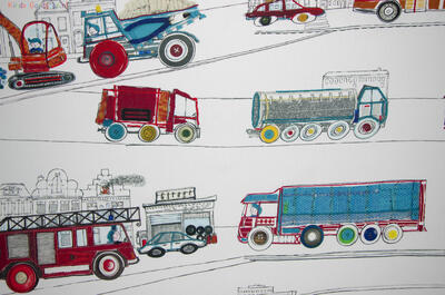 Vrachtwagens, brandweerauto's, kraanwagens... Tover de kinderkamer om tot een stoere kamer met deze gordijnen naar ontwerp van Hanneke de Jager. De print is helemaal met de hand getekend.