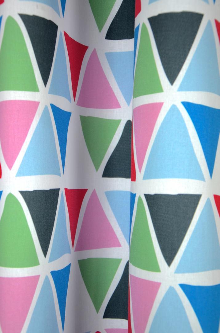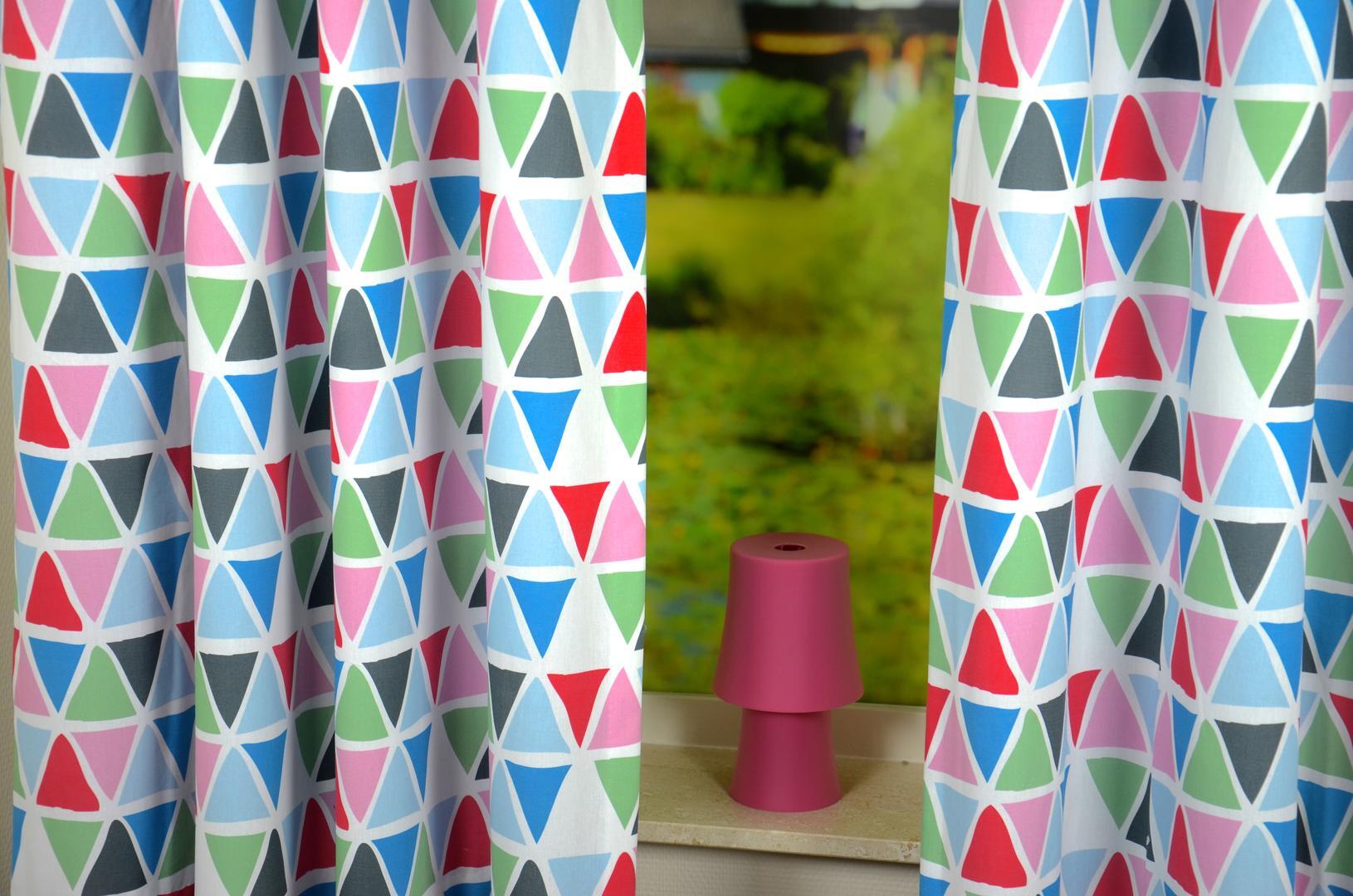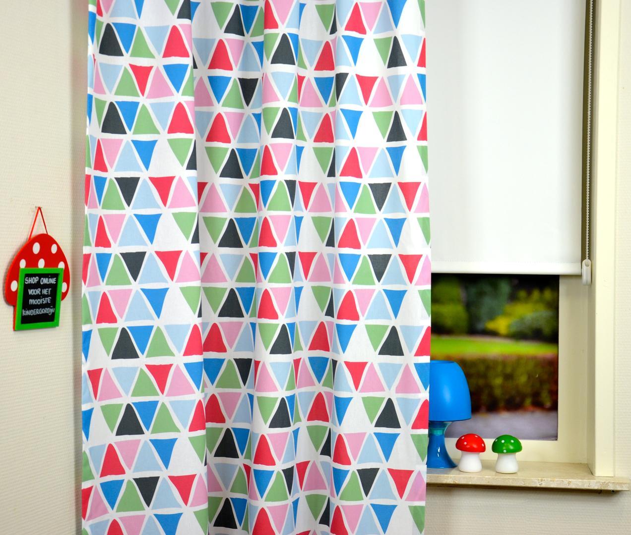 Tijdloos kindergordijnen met driehoeken in verschillende frisse kleuren. Leuk voor jongens en meisjes. Op zoek naar bijpassende kussens? U kunt deze optie aanvinken in het bestelproces.