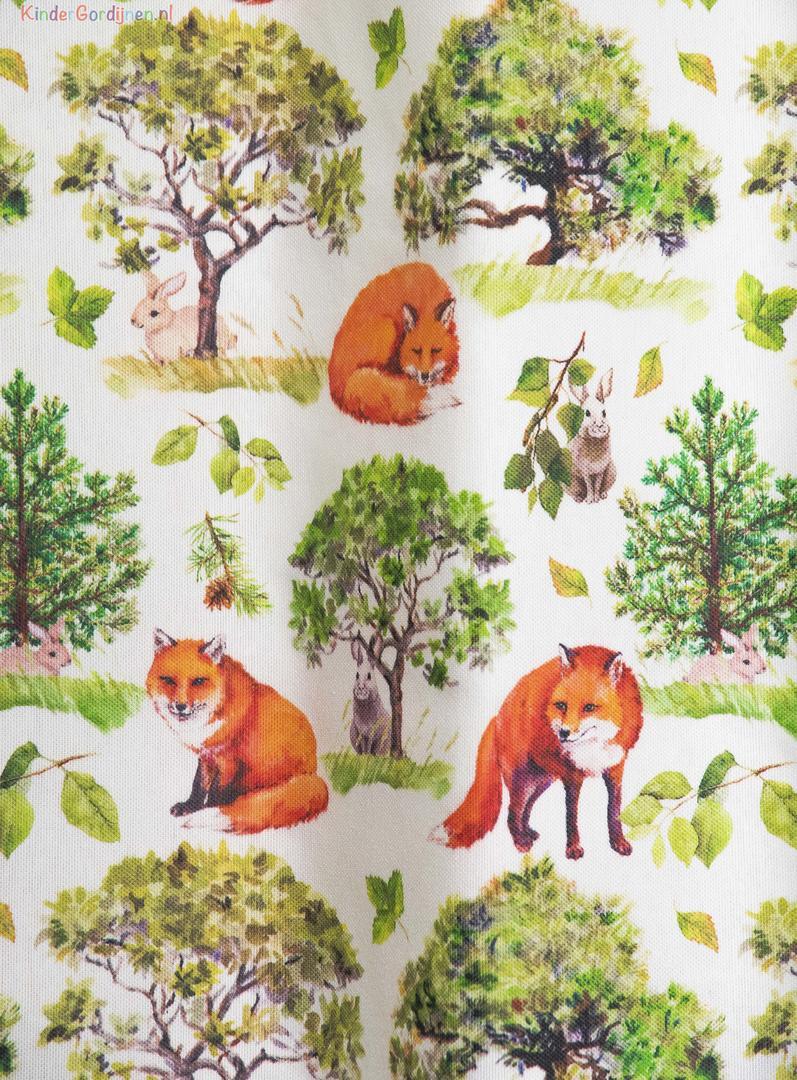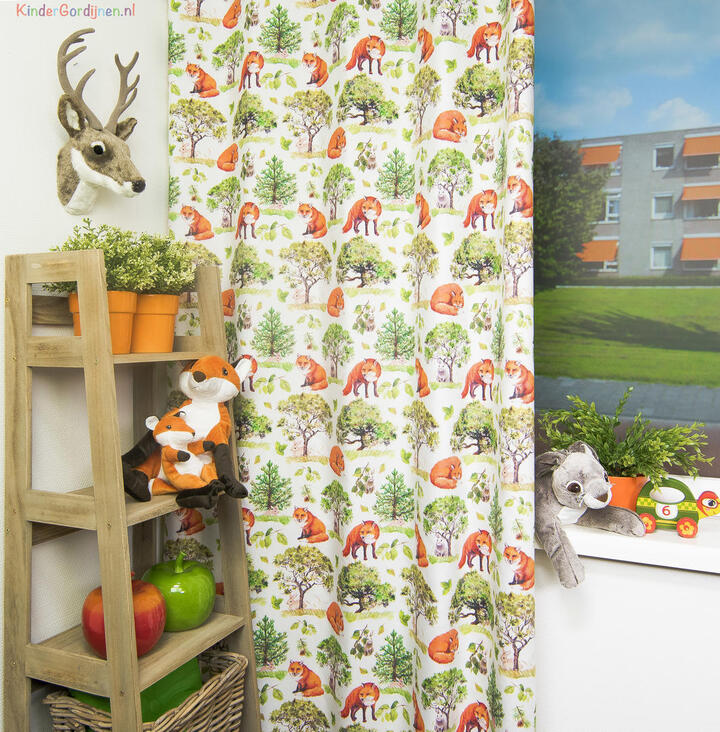 Oh kijk dan! Hier wordt je je toch gelijk vrolijk van. De tekeningen op dit kindergordijn kunnen zo uit een kinderboek gekropen zijn. Ze zijn zo mooi en levendig. En door de witte achtergrond komen de bomen en vossen helemaal goed tot uiting. De samenstelling van dit kindergordijn is 100% katoen en hierdoor is het een soepel en zacht gordijn en uitermate geschikt voor in een kinderkamer. En je kan het ook nog laten verduisteren zodat je kindergordijn in één keer klaar is. Als je het zelf wil voelen en zien dan kun je een knipstaal bestellen zodat je het thuisbezorgt krijgt en het zelf kan voelen en zien of het iets is voor bij jouw in de kinderkamer.
