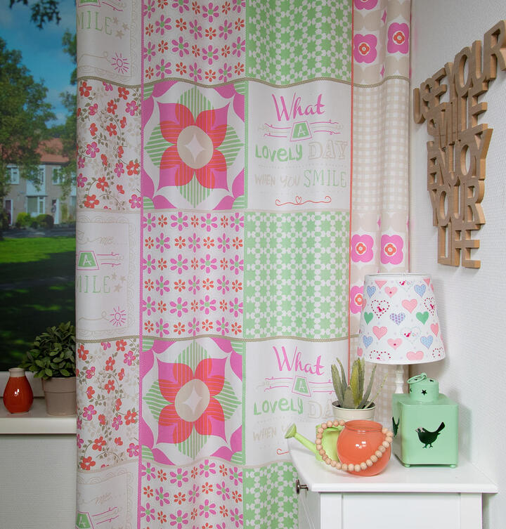Laat de kamer van je dochter stralen met het meisjesgordijn "Smile"! Dit kleurrijke kindergordijn brengt vreugde in elke meisjeskamer. Gemaakt van een soepele mix van 50% polyester en 50% katoen, biedt het niet alleen een prachtige uitstraling, maar ook duurzaamheid en flexibiliteit. De grote vlakken bevatten een afwisseling van matte kleuren met bloemetjes, sterretjes, ruitjes en zelfs lieve teksten, waardoor dit gordijn een speelse en vrolijke uitstraling heeft. De hoogwaardige stof is lichtdoorlatend en kan worden gecombineerd met een voering voor verduistering, isolatie en geluidsreductie. Bestel eenvoudig knipstalen om zeker te zijn van je keuze. Klik op "bestel een knipstaal" en ontvang jouw samples vandaag nog. Heb je vragen? Ik sta klaar om te helpen.