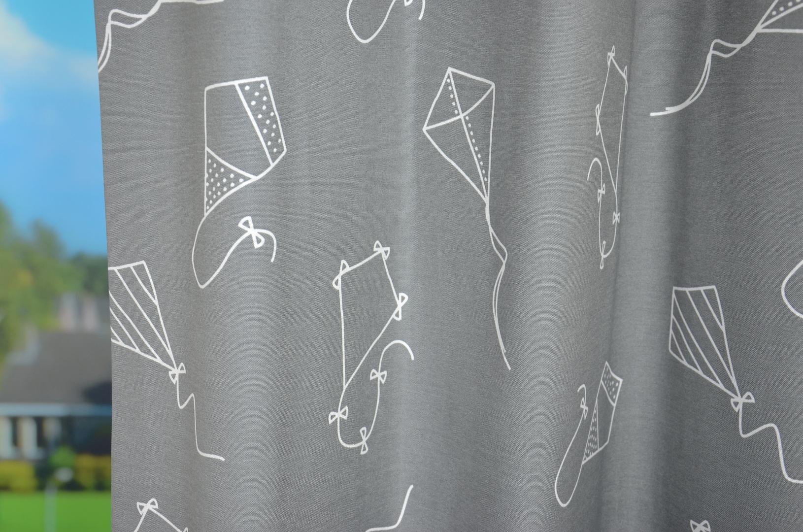 Dit is ons kindergordijn Kite, een ware eyecatcher voor elke kinderkamer! De vrolijke vliegers, gedrukt op een subtiele matte grijze kleur, brengen een speels en levendig element in de kamer. Bovendien is dit gordijn verkrijgbaar met een mat witte onderkleur met vliegers met een prachtige, gevarieerde kleurstellingen die ongetwijfeld de aandacht zal trekken. Met een flinke vlieger, inclusief staart van maar liefst 25 cm lang, maakt dit royale patroon het mogelijk om het gordijn prachtig tot op de grond te laten vallen. De stevige, sportieve stof kan zelfs van een verduisterende voering worden voorzien, waardoor het zowel stijlvol als functioneel is. Laat je verbeelding de vrije loop en geniet van heerlijke dromen onder dit unieke kindergordijn!
