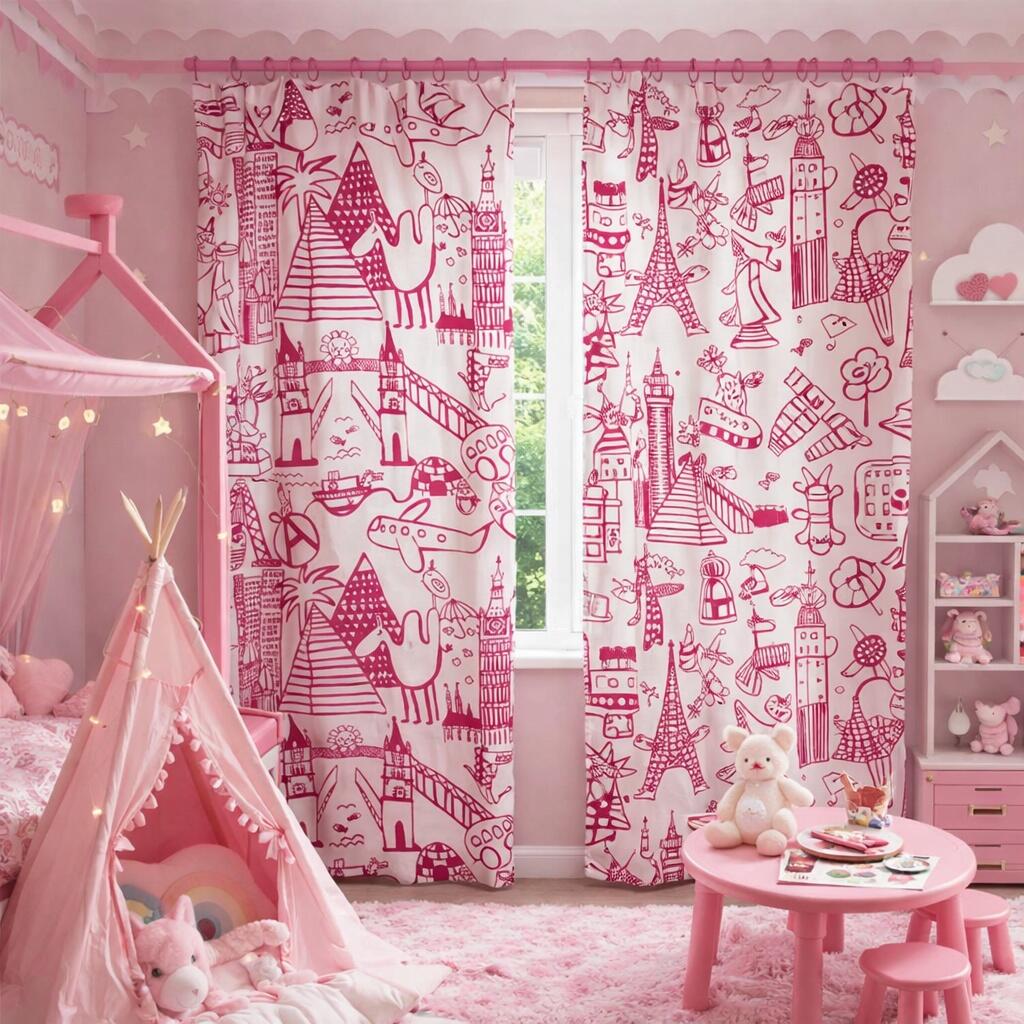 Gordijn World is een vrolijk en fantasierijk gordijn dat speciaal past in een meisjeskamer. Het speelse wereldthema nodigt uit tot kijken, dromen en verhalen verzinnen. Over de hele stof zijn handgetekende illustraties verspreid in een frisse roze kleur op een lichte, zacht gebroken witte achtergrond. Dankzij deze combinatie oogt het gordijn licht en vriendelijk, terwijl het dessin toch duidelijk aanwezig blijft.